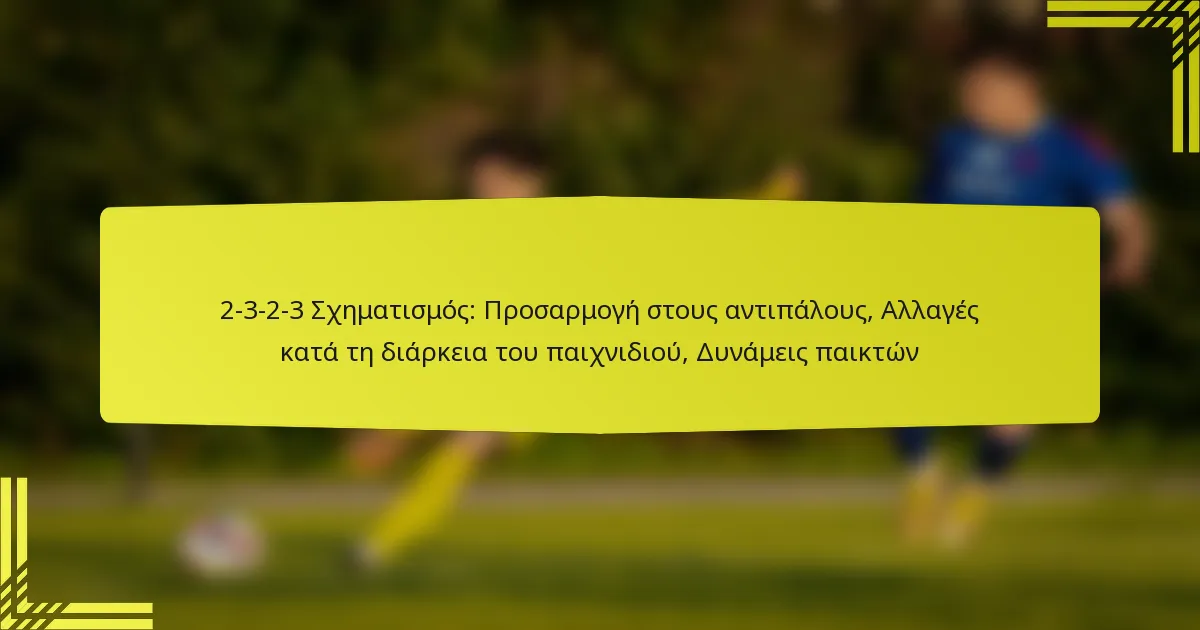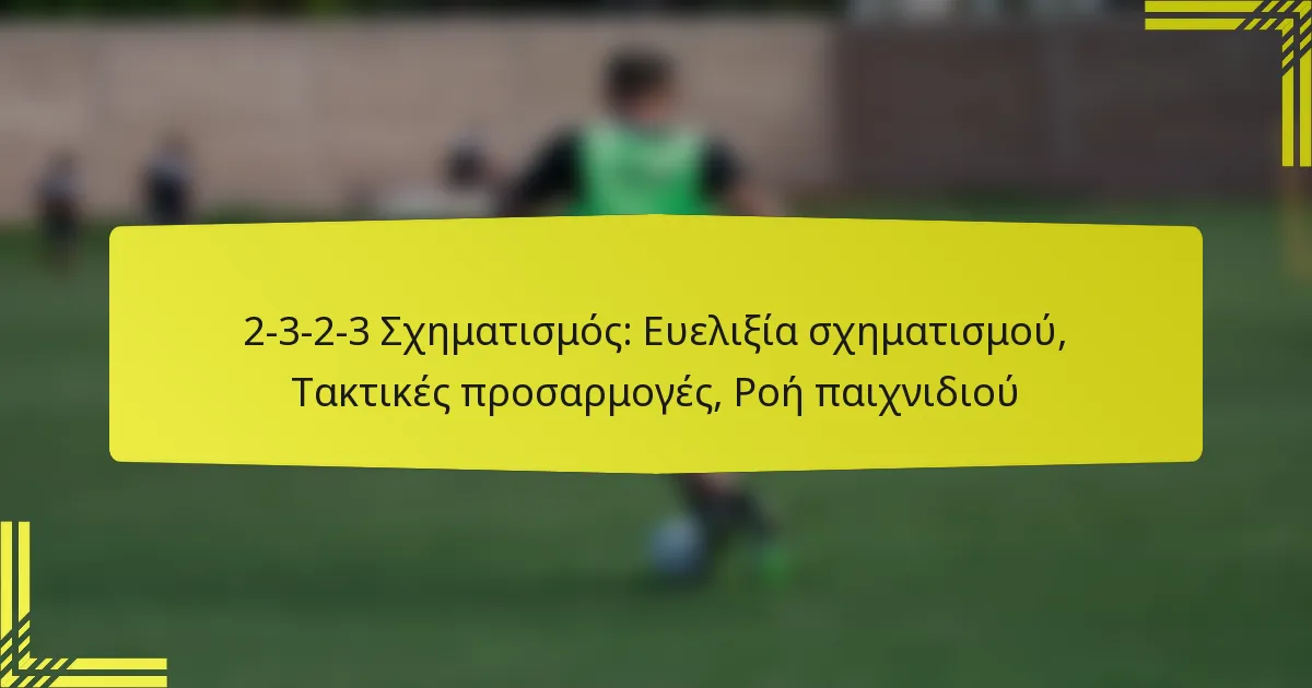 Η διάταξη 2-3-2-3 είναι μια τακτική ρύθμιση στο ποδόσφαιρο που τοποθετεί στρατηγικά δύο αμυντικούς, τρεις μέσους και δύο επιθετικούς, μαζί με έναν τερματοφύλακα. Αυτή η διάταξη προάγει μια ισορροπία μεταξύ αμυντικής δύναμης και επιθετικής δυνατότητας, διευκολύνοντας την ευέλικτη κίνηση και την αποτελεσματική διάταξη στο γήπεδο. Η κατανόηση της θέσης και της κίνησης των παικτών μέσα σε αυτή τη δομή είναι απαραίτητη για την βελτιστοποίηση της απόδοσης της ομάδας και την προσαρμογή στις δυναμικές του παιχνιδιού.